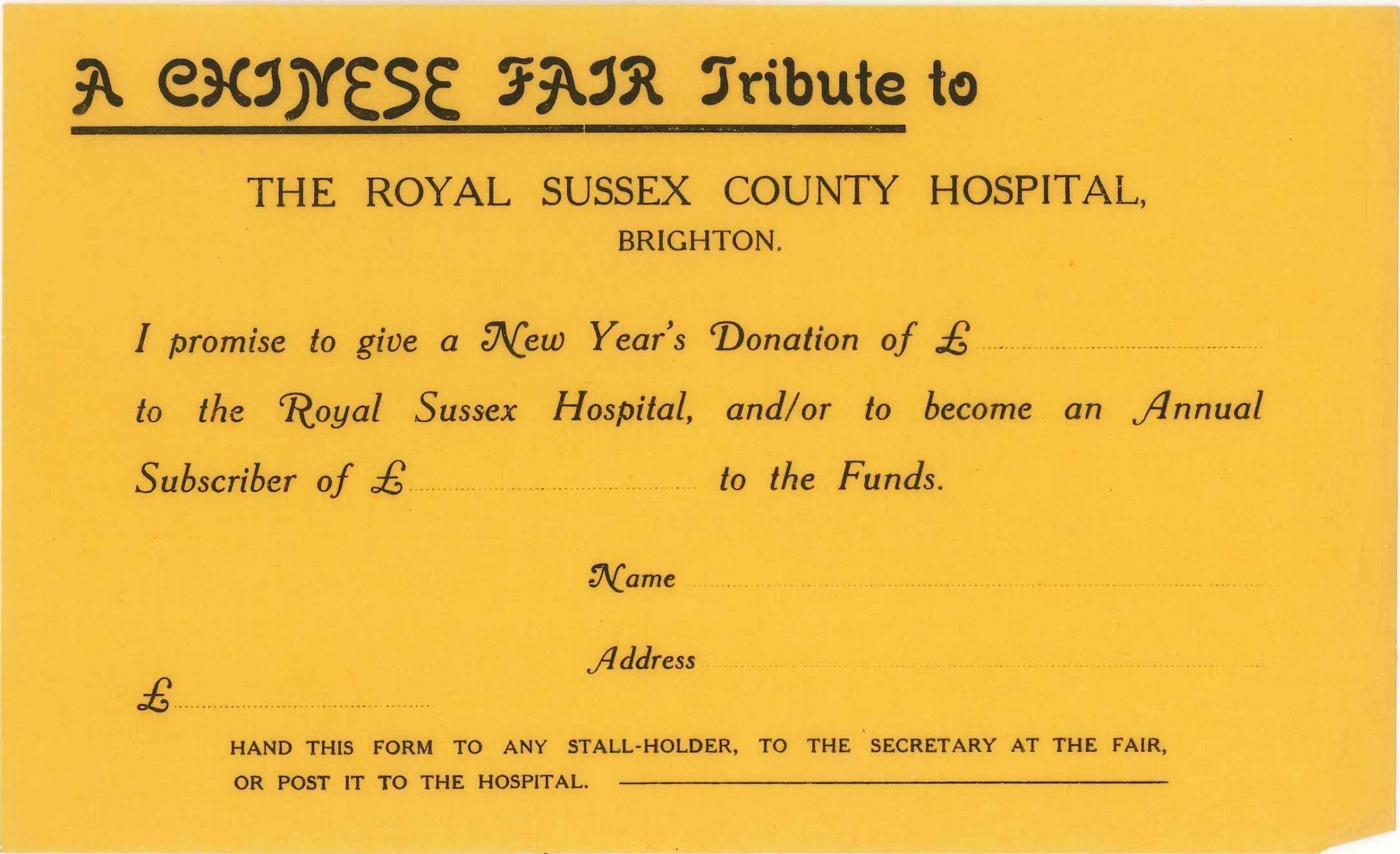 Fairs such as the ‘Chinese Fair’ held at Brighton Dome in November 1920 were regularly held to help fund Royal Sussex County Hospital’s activity, including accommodation, treatment and capital work.